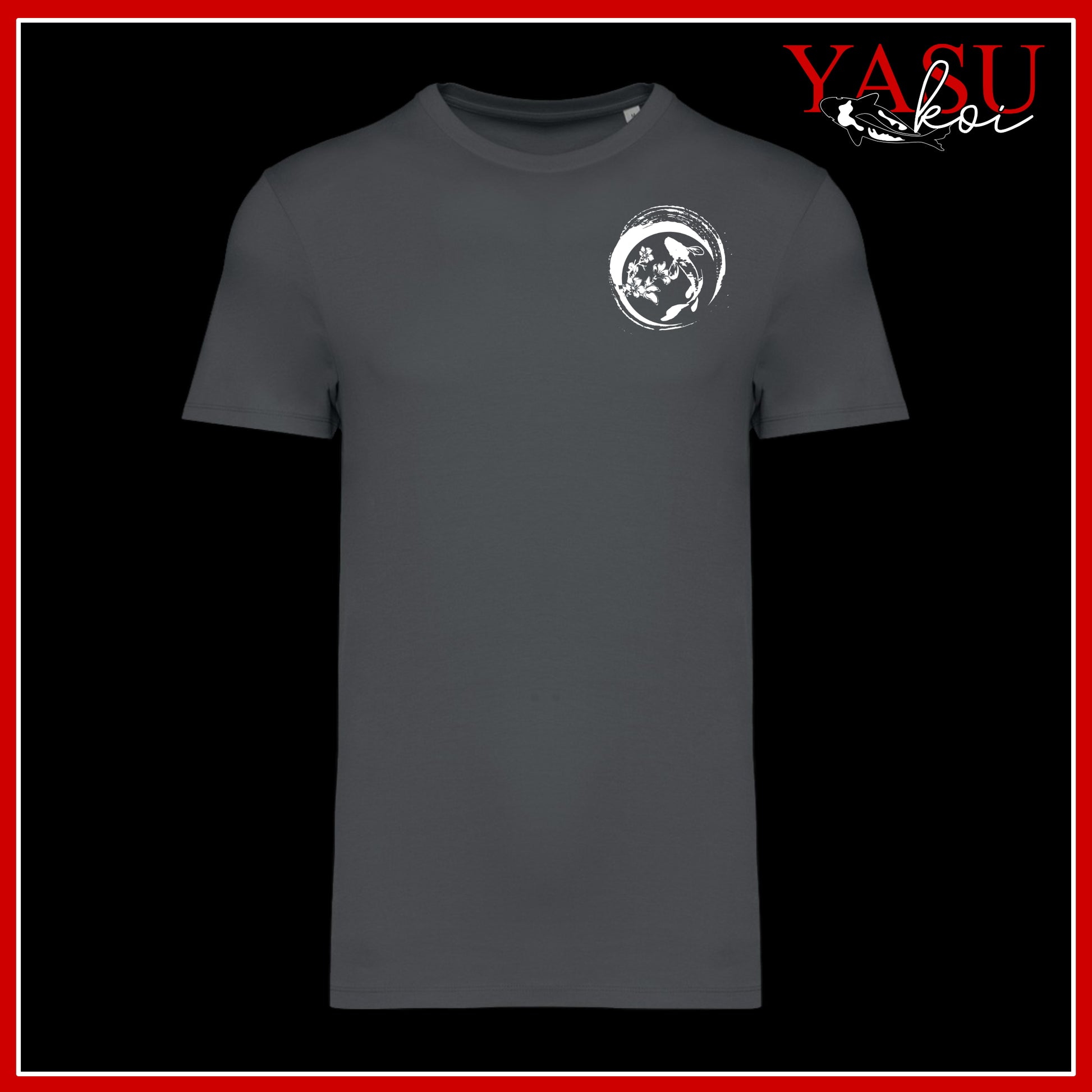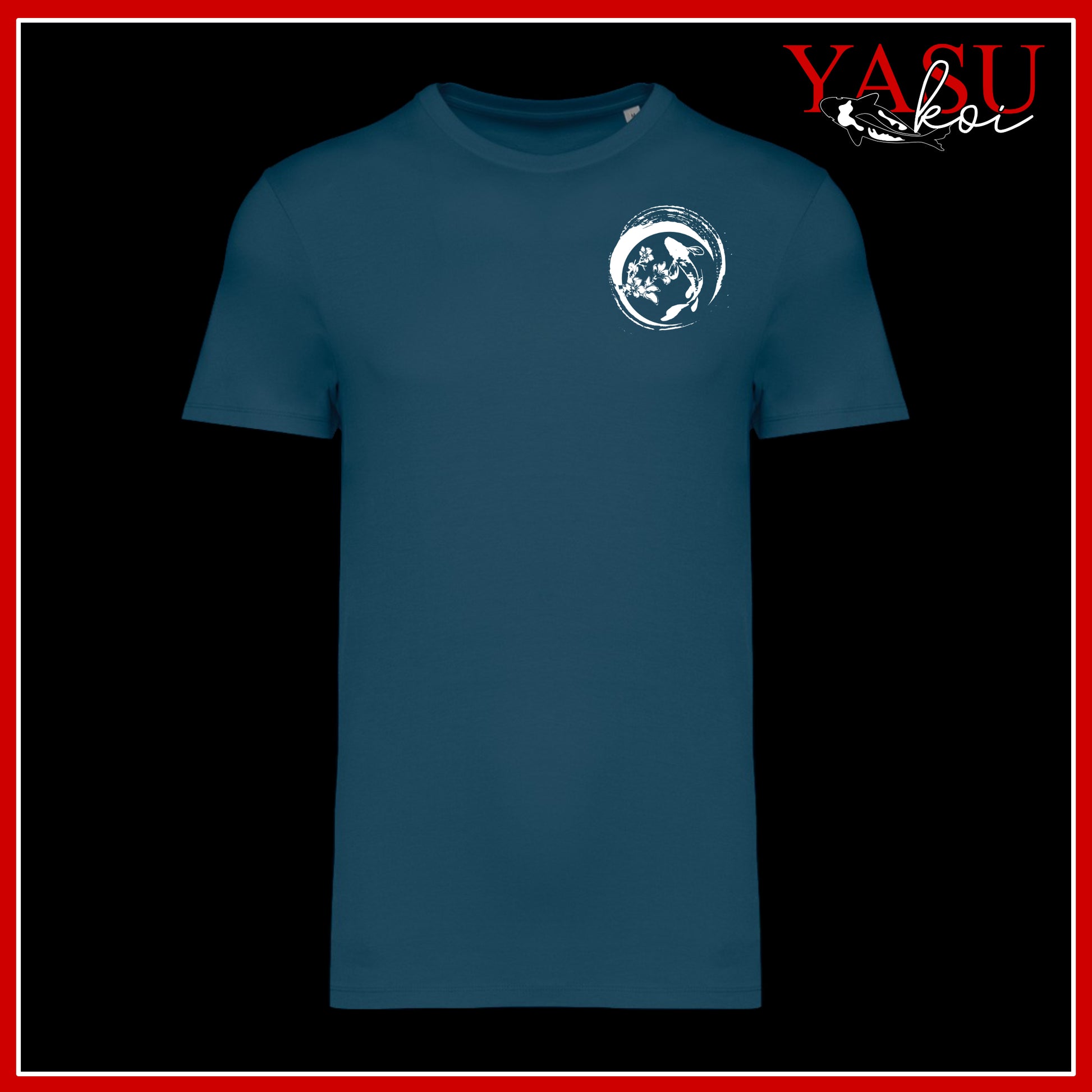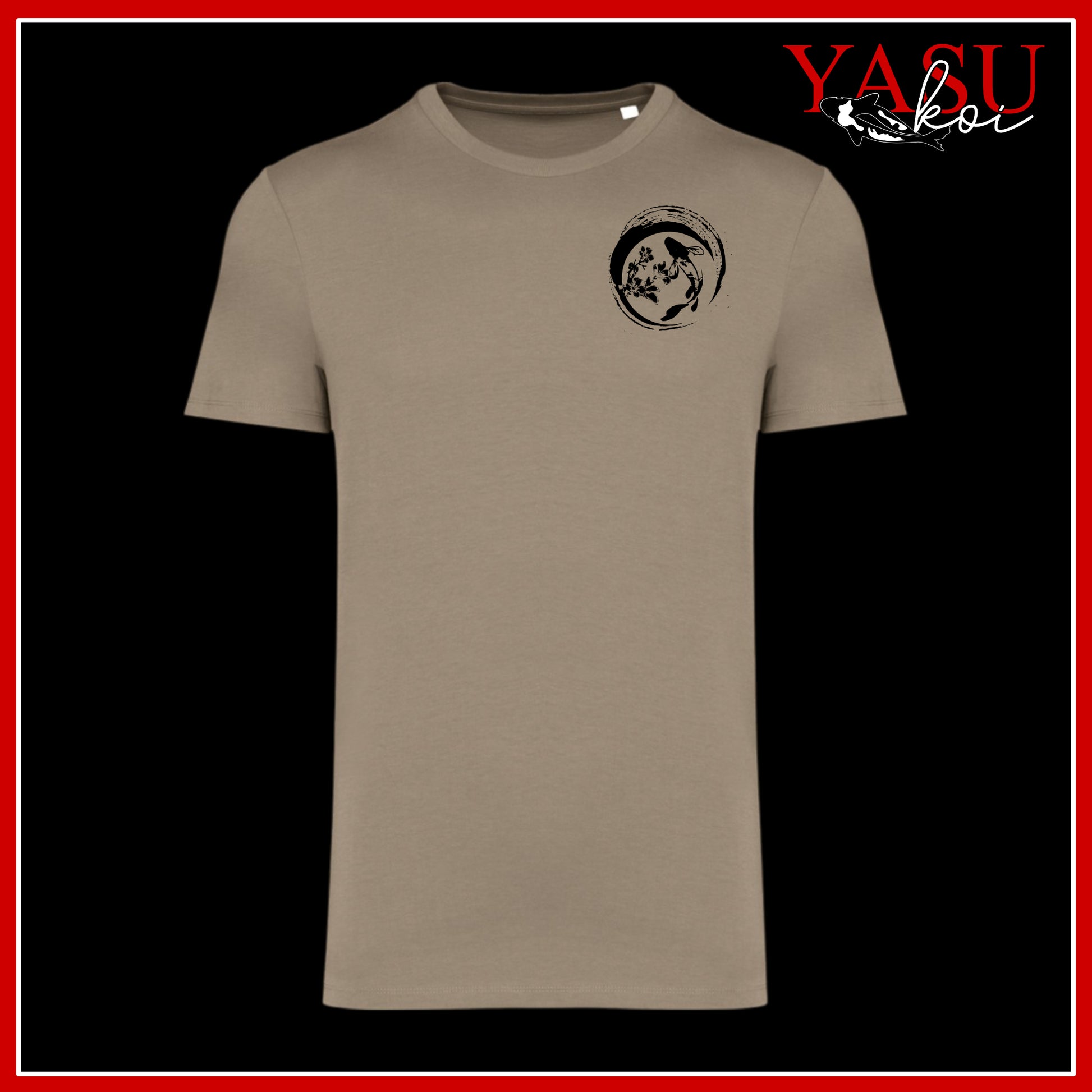 Stay comfortable and stylish in this 100% cotton organic t-shirt, adorned with a small logo showcasing elegant koi fish, delicate cherry blossoms, and serene water.