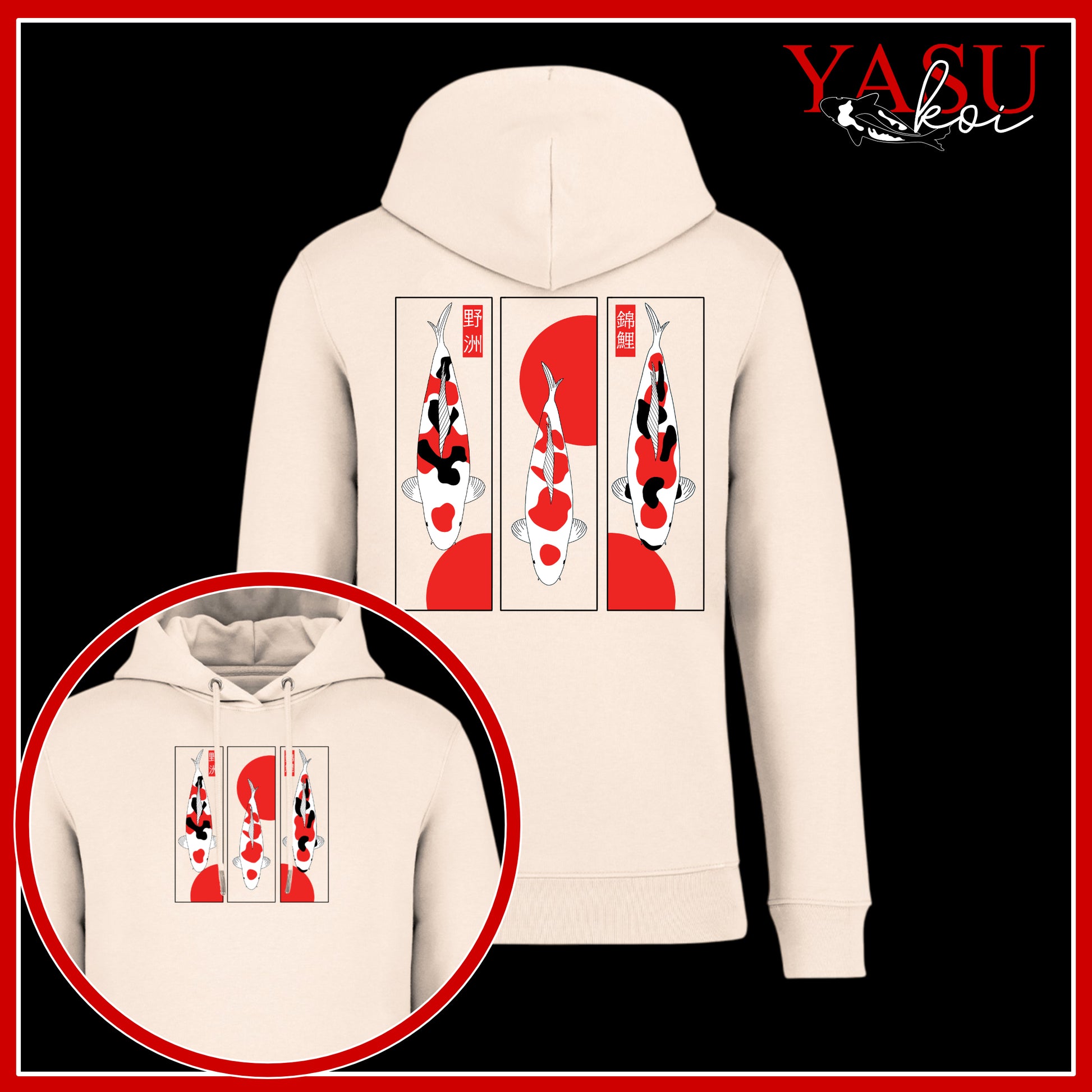 This organic cotton hoodie features the “Go Sanke” design, blending minimalist Japanese aesthetics with bold koi symbolism. The artwork is printed onto the fabric, ensuring a smooth, long-lasting finish that moves naturally with the shirt.
