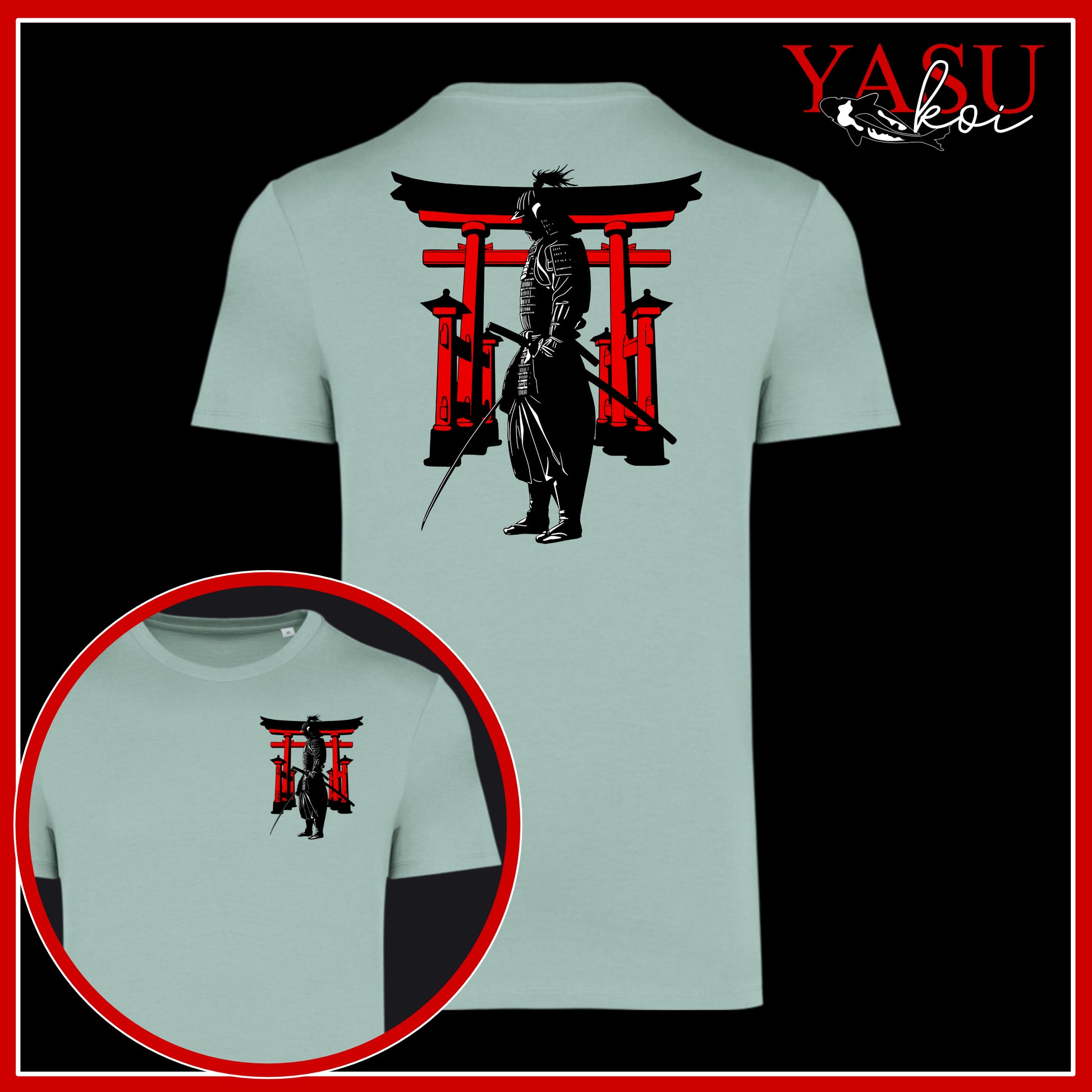The Gate Keeper captures the moment between worlds—where discipline, honor, and restraint converge. Centered on the back, a lone samurai stands before crimson torii gates, symbolising the threshold between the physical and the spiritual. The bold contrast of red and black against a natural base creates a striking visual that commands attention without saying a word.