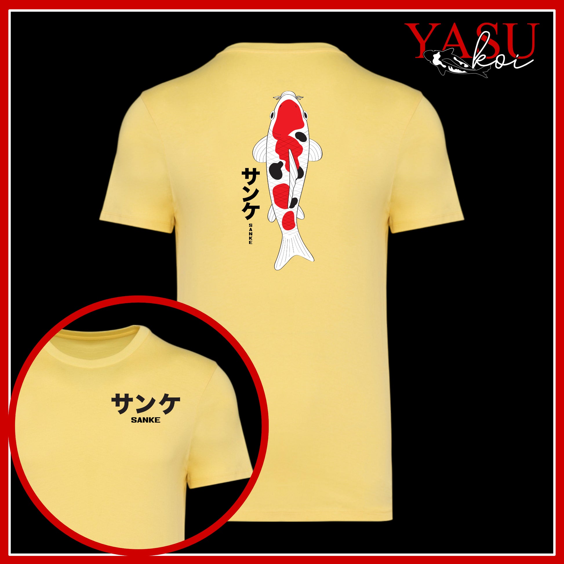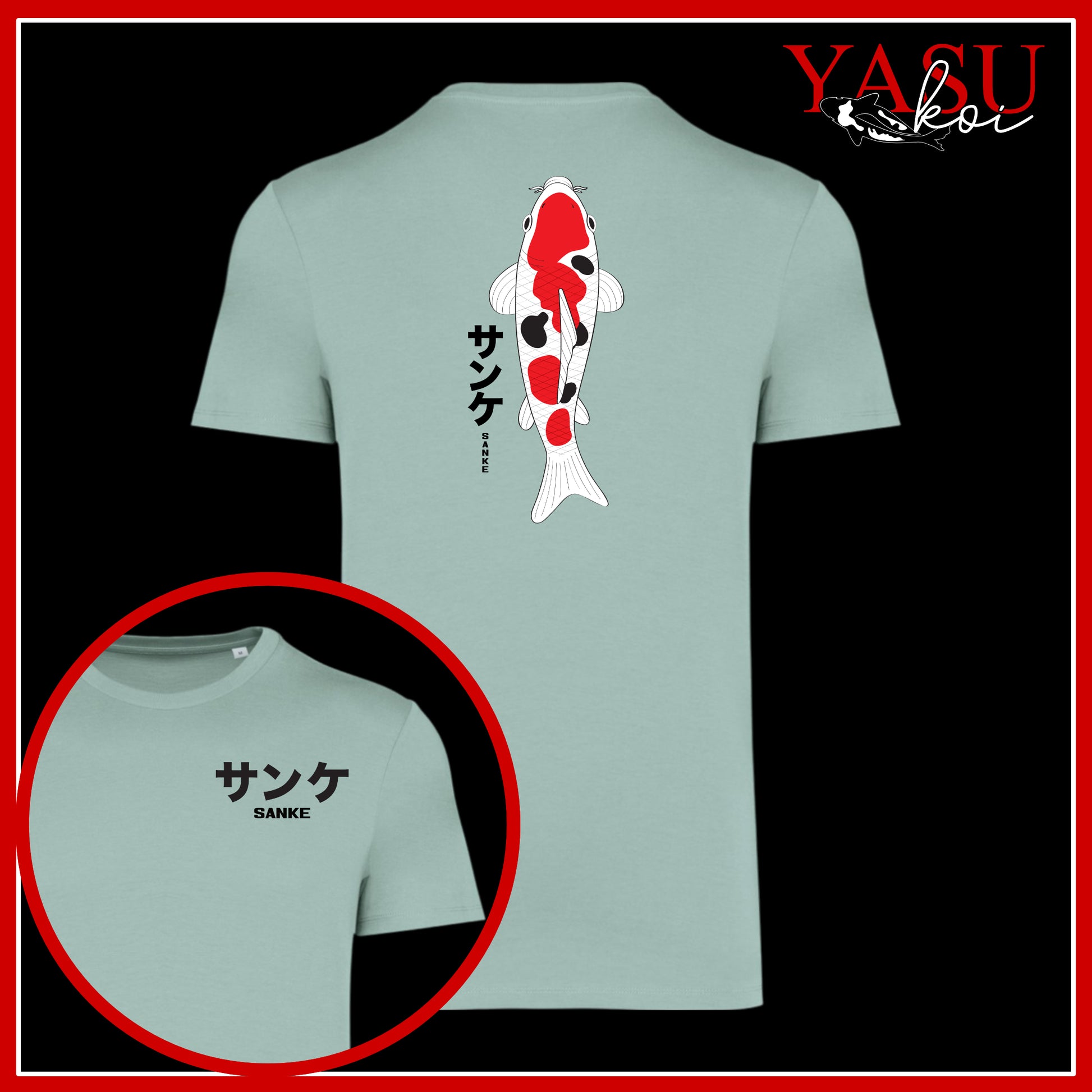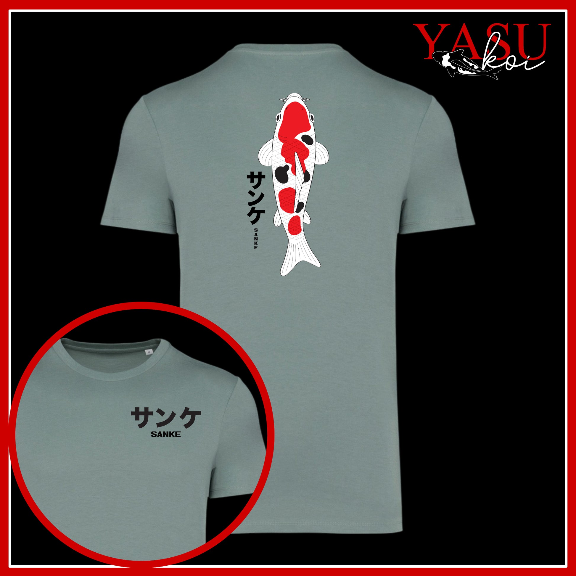 Feel the comfort of this organic combed cotton t-shirt featuring a stunning Sanke Koi print with Japanese lettering.