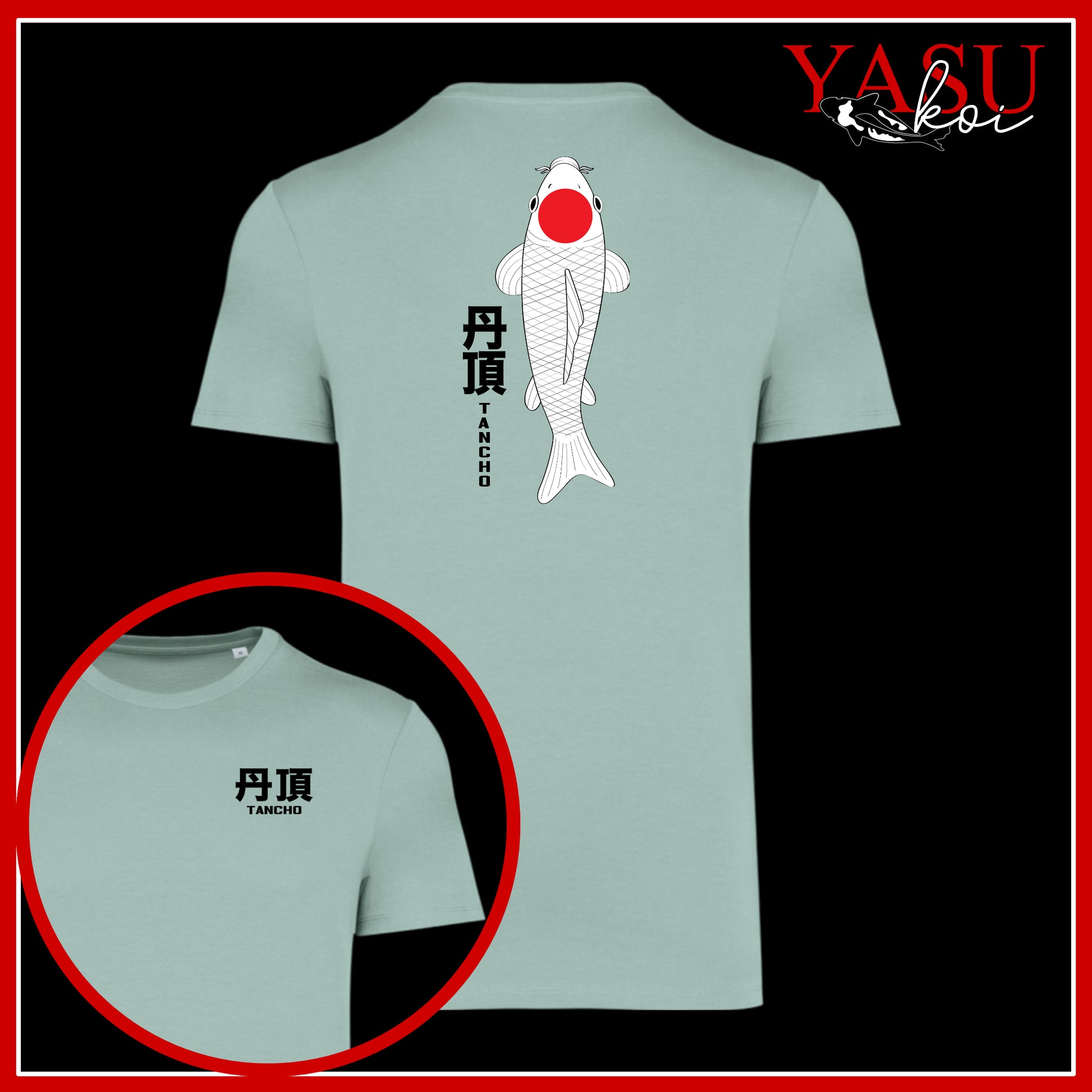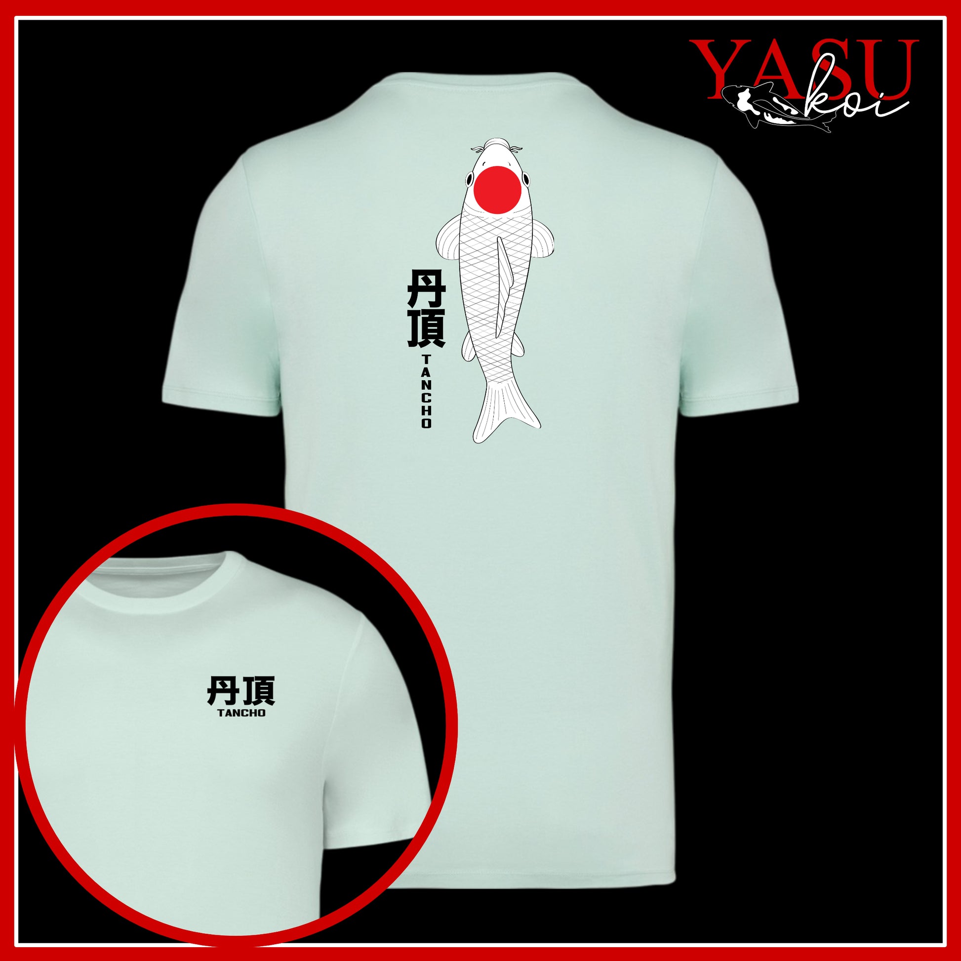 Elevate your wardrobe with our organic combed cotton t-shirt featuring a mesmerizing Tancho Koi design with Japanese wording.